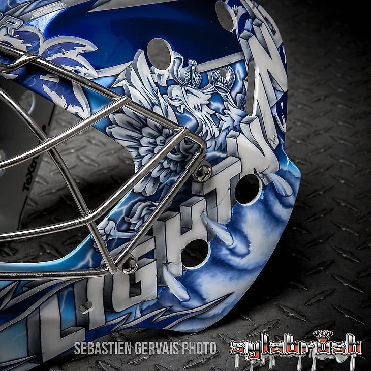 Дальше снова русский – Андрей Василевский. Маска клубных цветов с традиционным номером на подбороднике и дикой кошкой наверху. Весь шлем пронизывают молнии, а по бокам шлема расположились название клуба и 2 герба России. Одновременно клубная и патриотичная маска. Так держать, Андрей, а дизайнером шлема выступила Сильвия Марсоле.