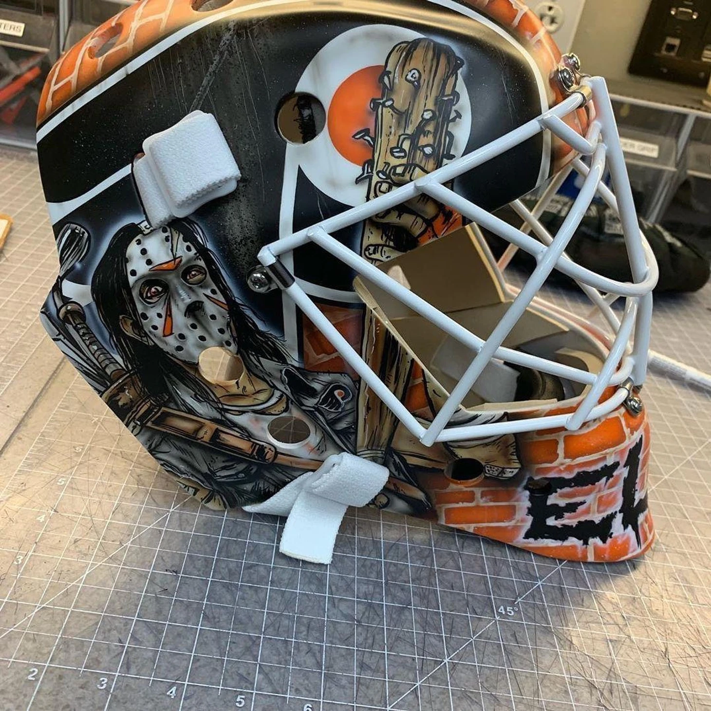 И бонусом – лучшая, на наш взгляд, вратарская маска нового сезона. Её обладатель – Алекс Лайон из «Филадельфии». Бонусом она идёт, потому что Лайон выступает в АХЛ, имея двусторонний контракт, но его шлем в любом случае заслуживает внимания. Отсылка к одному из самых популярных фильмов этого года выглядит ярко и пугающе. Вообще Лайон – большой любитель хорроров. В прошлом году его маску также украшал Пеннивайз, а 2 года назад были отсылки к серии фильмов «Пила». Дизайнером шлемов выступил уже знакомый нам DaveArt.