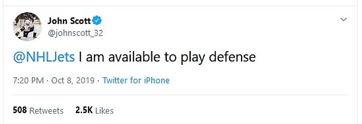 Твит месяца: глядя на проблемы «Виннипега» в обороне, даже Джон Скотт готов предложить свои услуги. Не знаю, как насчет уровня игры, но с ним точно было бы веселее.