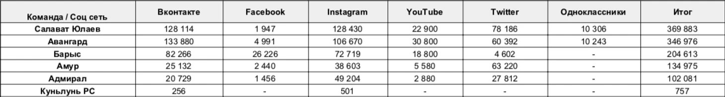К сожалению, пришлось пойти на уступки в случае с «Салаватом Юлаевым». У уфимцев есть ссылки на ВК и Instagram, но остальных ссылок я не нашёл. Я посмотрел количество подписчиков в отсутствующих социальных сетях и пришёл к выводу, что это либо недоразумение, либо я лентяй и плохо изучил сайт. Всё бывает.