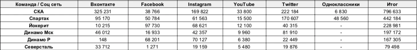 Напомню условия создания данного рейтинга: у клуба на сайте должна быть ссылка на своё сообщество в социальной сети. Галочки (верифицированность сообществ) пока не рассматриваем, но об этом можно поговорить позже. Цифры по YouTube условные, так как число вплоть до подписчика может видеть только владелец канала.