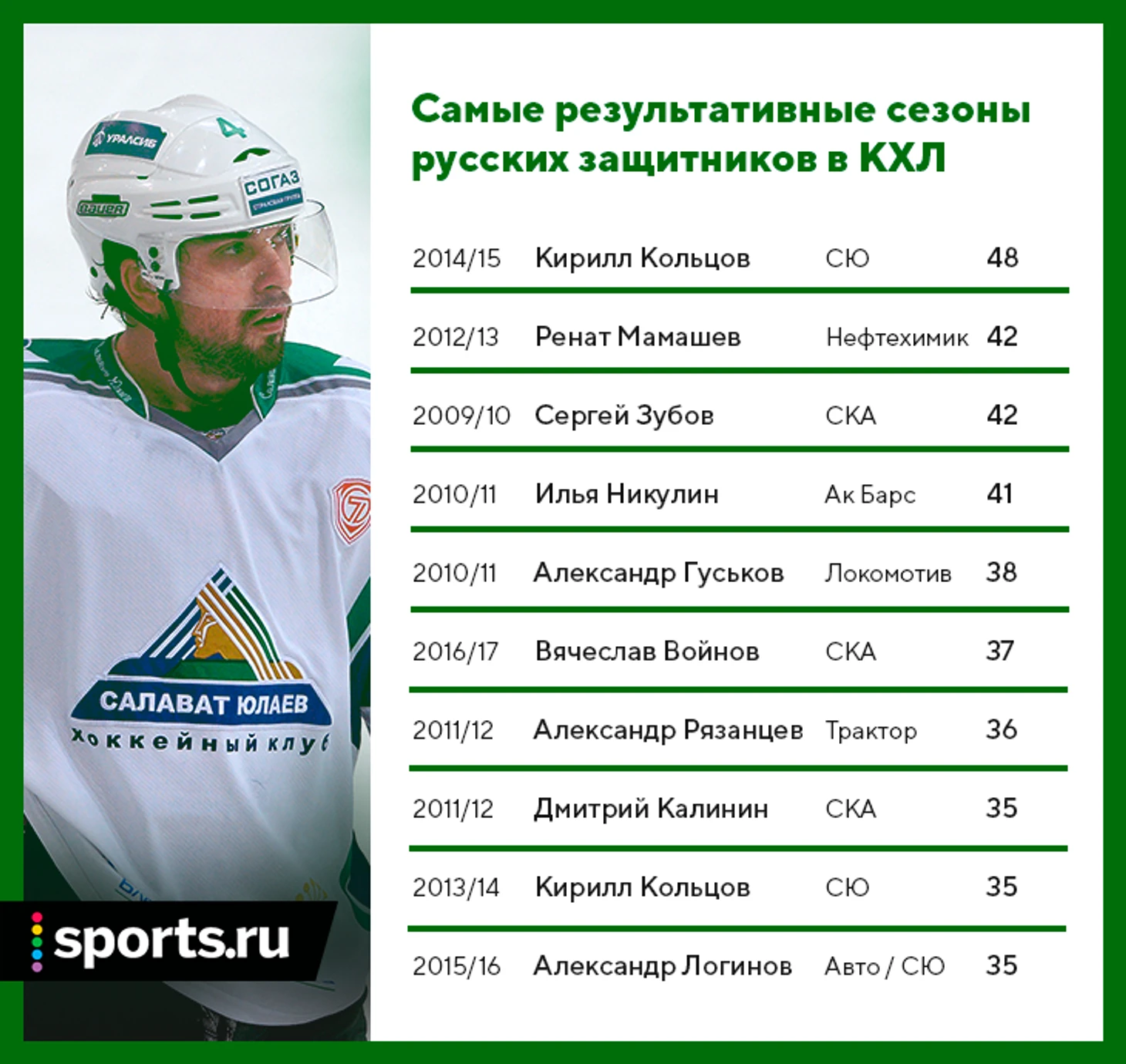В локаутном сезоне-2012/13 в топ-10 среди защитников было 8 русских игроков, причем только Сергей Гончар приехал из НХЛ. Из этих восьми всплеск Рената Мамашева был однократным — остальные заслуженные люди: Белов, Калинин, Никулин-Медведев, Прошкин. Тот сезон был пиковым для наших защитников — уже через год из хит-парада вынесло половину, и обратно никто не вернулся.