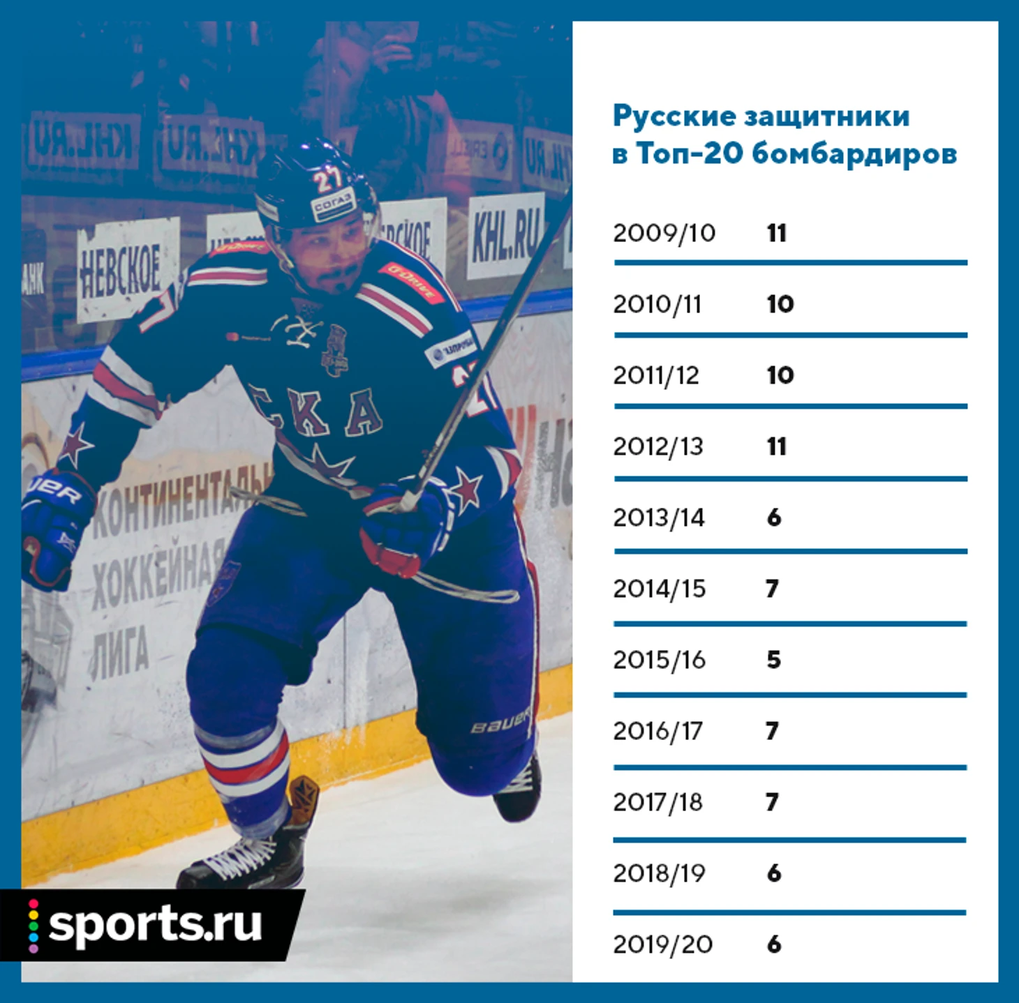 Во-первых, гиперконцентрация паспортных талантов в базовых клубах, которой не было в «медведевский» период КХЛ. В «Салавате»-2011, который был базовым клубом неофициально, играли два защитника-легионера, а в четвертой паре выходили молодые. В СКА-2011/12, который тогда еще не сметал все, что нравилось, в низших парах играли в основном домоседы (Петров, Семенов, Воробьев, Вишневский). Потом ситуация поменялась: СКА на этапе максимального приближения к уровню сборной мог поставить рулить большинством любого своего защитника, за исключением откровенно оборонительных Рукавишникова и Юдина. Это было абсолютно ненормально.