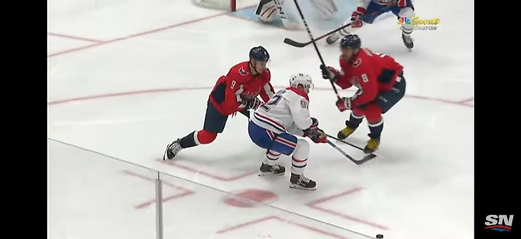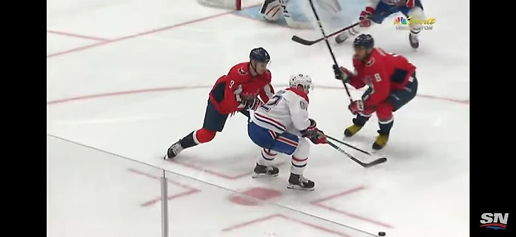 В чем проблема? Если посмотреть эпизод в динамике, то видно, как коньки Овечкина отрываются ото льда, что запрещено правилами. Проблема в том, что не очень понятно, как происходит отрыв коньков – в результате прыжка или уже после контакта Овечкина с Друэном в результате столкновения на большой скорости.