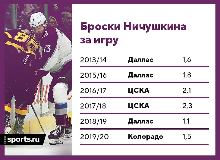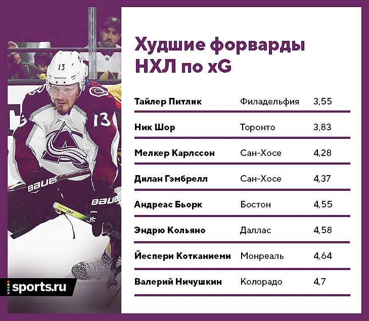 Теперь Ничушкин — один из худших форвардов НХЛ по ожидаемым голам. Во время его присутствия на льду «Колорадо» почти не создает опасных моментов: