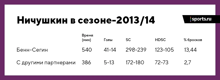 В прошлом году Ничушкина гоняли по составу и перепробовали самые различные сочетания (впрочем, в прошлогоднем «Далласе» устойчивой была только первая тройка) — не получалось толком нигде. Даже из прошлогодних 10 очков 5 были набраны при участии кого-то из парочки Бенн-Сегин. По продвинутой статистике, лучше всего у Ничушкина получалось рядом с чисто оборонительным игроком Джейсоном Дикинсоном.