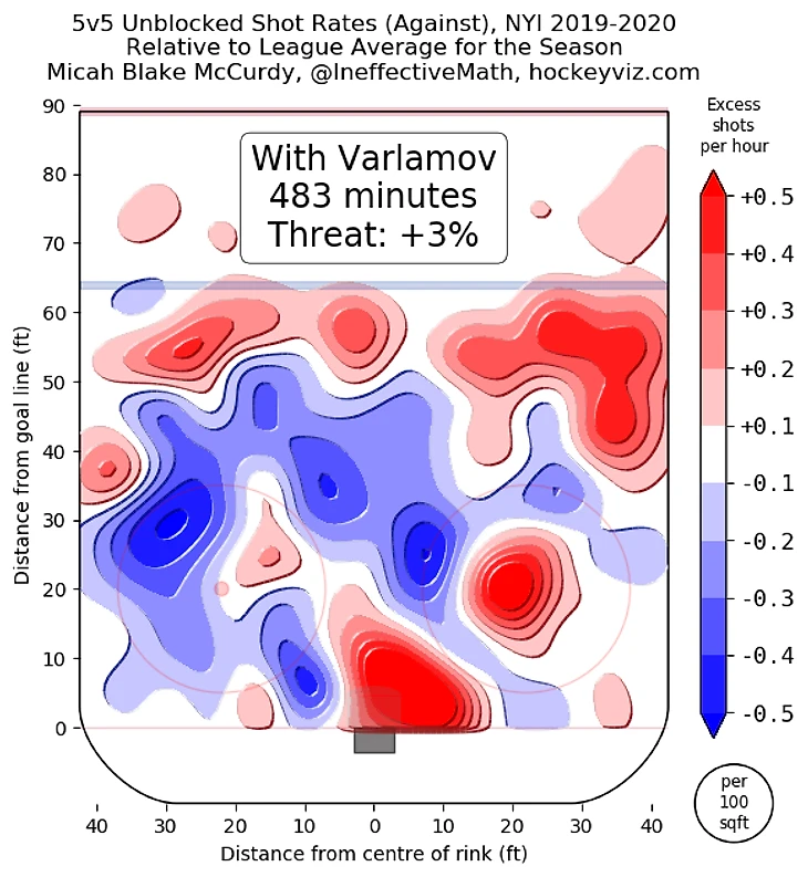 На диаграмме видно: в равных составах с пятака по воротам Варламова наносят больше бросков, чем в среднем по лиге. При этом игрокам «Айлендерс» удается вычищать пространство в кругах вбрасывания и вытеснять соперника на периметр. Отчасти это и объясняет тепловую активность на пятаке – сопернику приходится преодолевать плотную защиту и переходить к набросам в надежде на подправления и добивания.