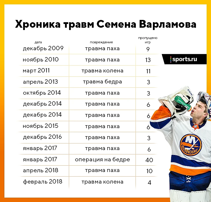 У Семена есть уязвимое место – пах. Проблемы начались еще в «Вашингтоне», позже было несколько тяжелых травм, операция и почти полностью пропущенный сезон-2016/17. Хроническая травма паха – почти приговор для хоккейного вратаря, особенно если он играет в плотном графике и в команде, которая не слишком заботится о защите. Для Варламова каждый эффектный сэйв в шпагате мог стать причиной травмы – и это был один из факторов риска, когда «Айлендерс» его подписывали.