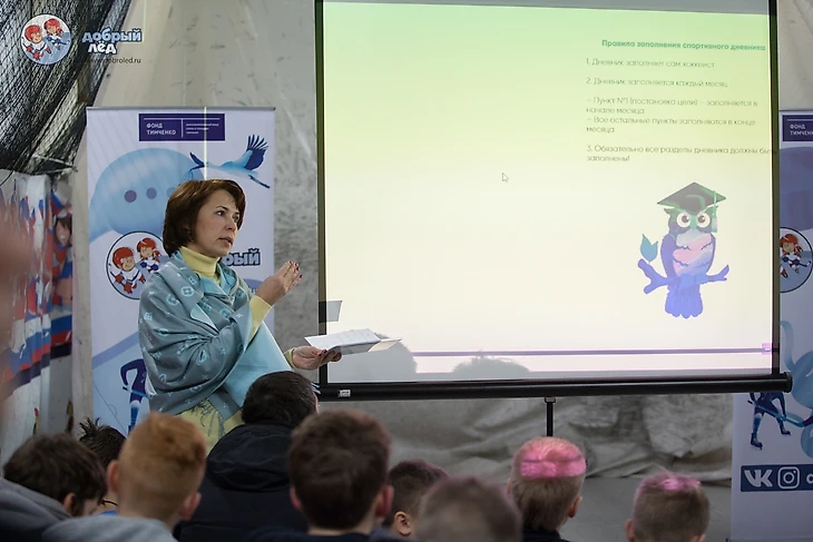 В рамках «Кубка Черных беретов» для юных хоккеистов и их родителей состоялась презентация Спортивного дневника. Психолог программы «Добрый лёд», д.м.н. Юлия Родыгина рассказала о новом проекте, который призван помочь в исследованиях научного корпуса программы. Участники турнира стали первыми, кто получил для заполнения Спортивный дневник «Доброго льда».