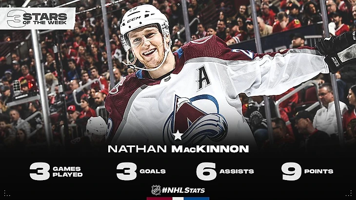 Первая звезда - Натан Маккиннон, "Колорадо" - 3 игры, 3+6, "+5"