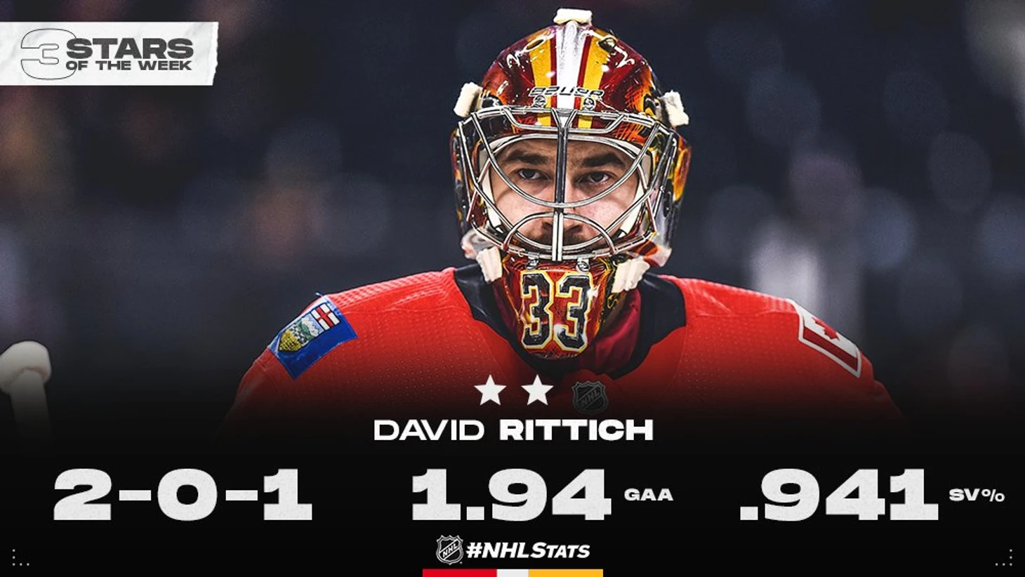 Давид остановил 95 из 101 броска, нанесенного по его воротам, что помогло "Флеймз" набрать 5 из 6 очков на этой неделе. Первая игра с "Питтсбургом" закончилась поражением в овертайме, и Риттиху пришлось потрудиться, чтобы отбить 35 бросков и сохранить свою команду в игре. Дальше бы матч с "Баффало", где снова все решалось в овертайме, на этот раз удачнее - победа 3:2 и 34 сэйва от чеха. Последний матч на неделе, с "Оттавой", оказался самым простым для Давида, который совершил 26 сэйвов и помог команде выиграть 3:1. Всего же за сезон у Риттиха 23 игры, 12 побед при показателях 2.68 и 91.5%.