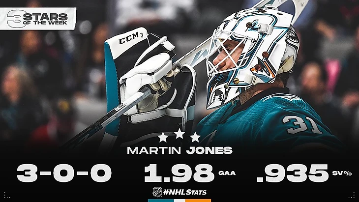 Третья звезда - Мартин Джонс, "Сан-Хосе" - 3 игры, 3-0-0, 1.98 коэффициент надежности, 93.5% отраженных бросков
