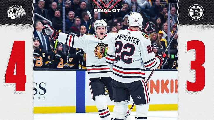 "Бостон Брюинз"-"Чикаго Блэк Хоукс" 3:4 (ОТ).Джонатан Тэйвз в овертайме принёс победу гостям.Дилан Стром набрал 2 очка (1+1),Коннор Мерфи отдал 2 результативные передачи,Робин Ленер отразил 37 бросков.В 3 периоде Зак Смит подрался с Джоном Муром.