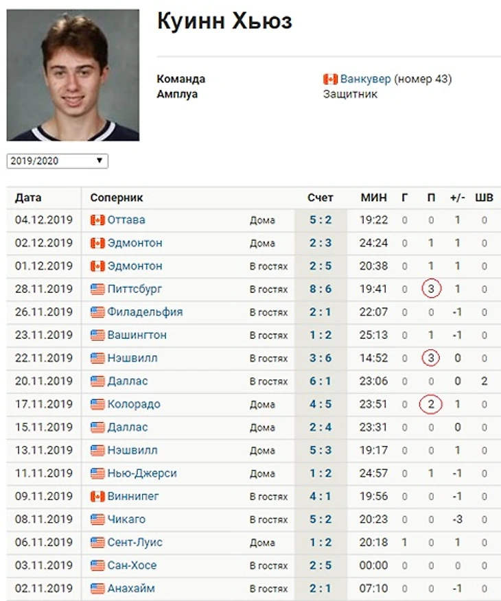 Но наибольший прогресс среди новичков, таки следует заметить, у коллеги по амплуа Макара – Куина Хьюза. Он стремительно ворвался в ноябре месяце в тройку лучших бомбардиров-новичков, а его игра за «Ванкувер» в последнее время обретает все новые краски. Малогабаритный защитник «Кэнакс» набирает свои очки в матче за счет отменного катания и умелой игры в пас. Особенно удачными получились у него две игры в ноябре на выезде с «Нэшвиллом» и «Питтсбургом» в которых он сумел сделать по три голевых ассиста партнерам по команде. В условиях, когда в команде отсутствуют креативные защитники, при всем уважении к Александру Эдлеру, он уже возрастной и никогда не блистал умением подключатся к атаке, Куинн Хьюз занял эту нишу и хорошо справляется с ролью так называемого «полузащитника».