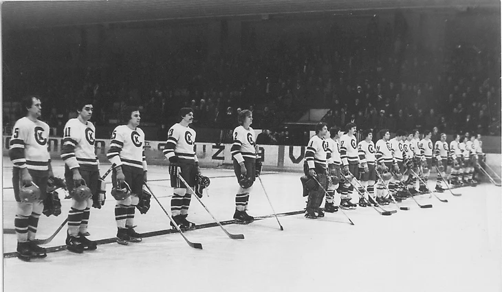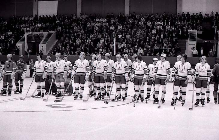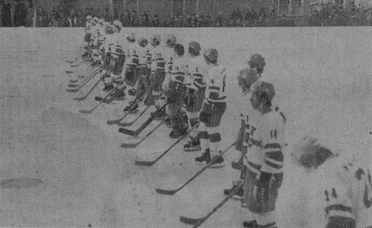 26 августа 1979 года. Череповец. СКЗ «Алмаз». Торжественное открытие турнира на приз имени П.И. Беляева. Команда «Металлург» (Чепеповец), слева два хоккеиста из Новокузнецка