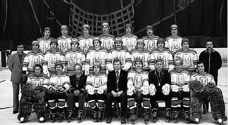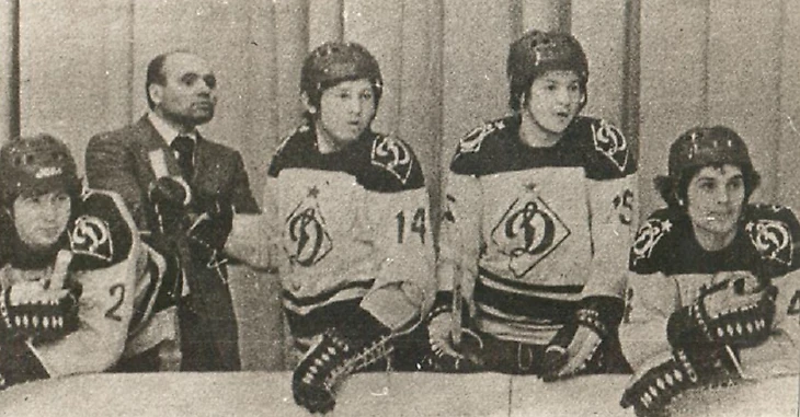 «Динамо» (Минск). Сергей Косых (№ 2), Виталий Иванович Стаин, Сергей Агулин (№ 14), Валерий Воронин и Владимир Кукушкин (два сезона (1976-78) играл за «Бинокор»)