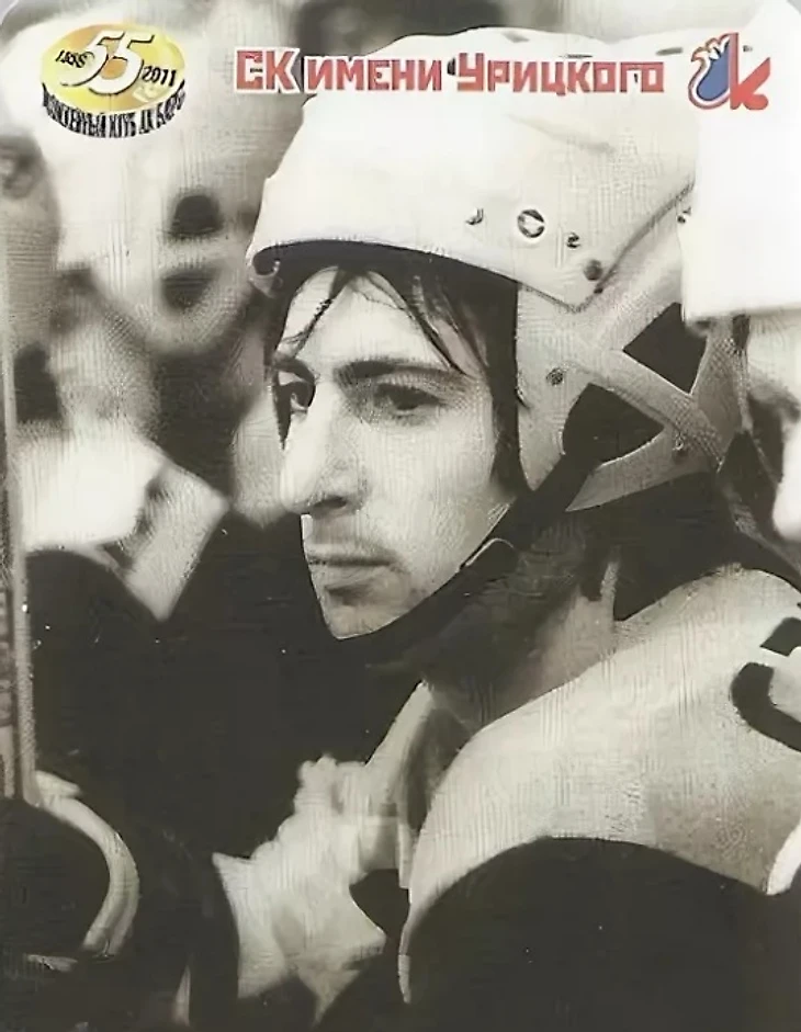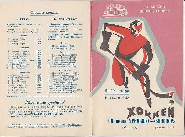 СК имени Урицкого (Казань). Ильдус Хуснуллин уже вернулся из Тольятти и играет под № 17, его «четверка» у Равиля Шавалеева. Сезон 1979/80? Или 1980/81? А эмблема очень похожа на ту, что будет в 1985/86 годах
