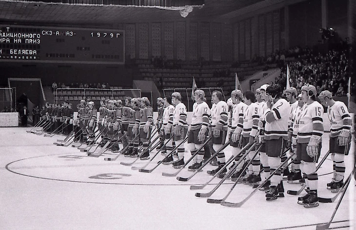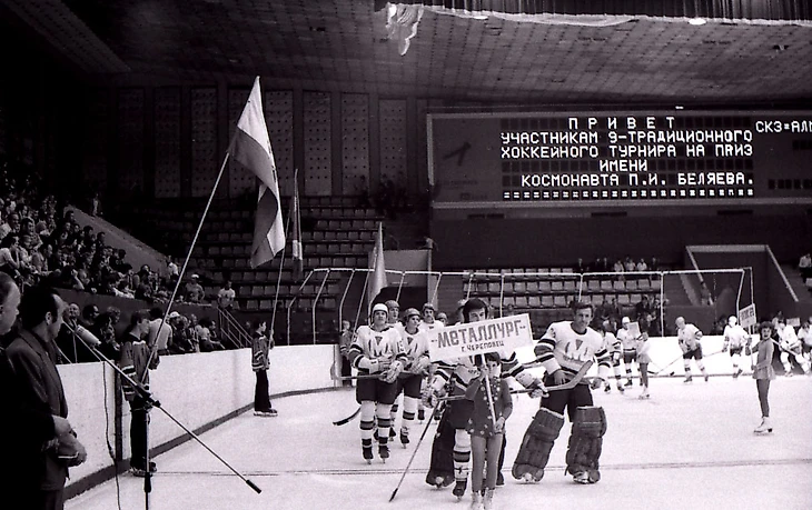 26 августа 1979 года. Череповец. СКЗ «Алмаз». Торжественное открытие турнира на приз имени П.И. Беляева. Справа хоккеисты чепеповецкого «Металлурга», в центре новокузнецкого «Металлурга»