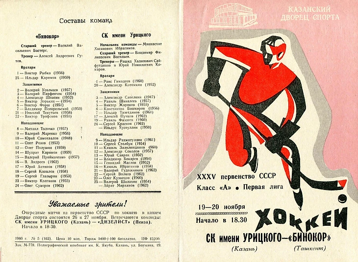 Программка казанского дворца спорта к встречам СК имени Урицкого и «Бинокором» в ноябре 1980 года