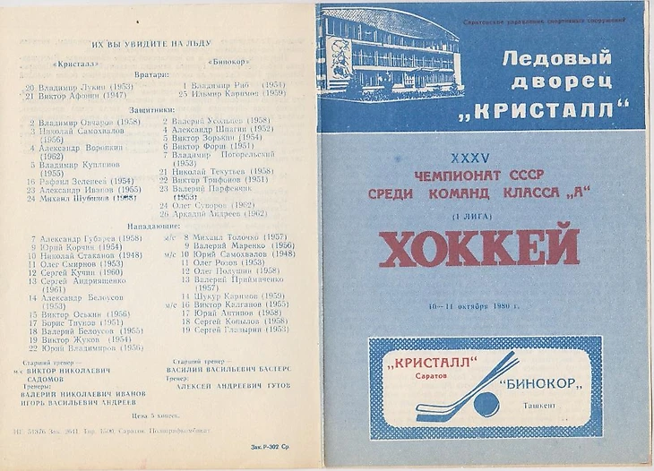 Программка Ледового дворца «Кристалл» сезона 1980/81 годов к матчам между саратовскими и ташкентским хоккеистами