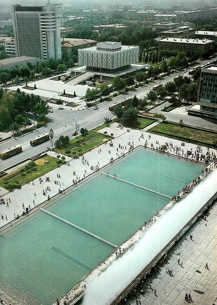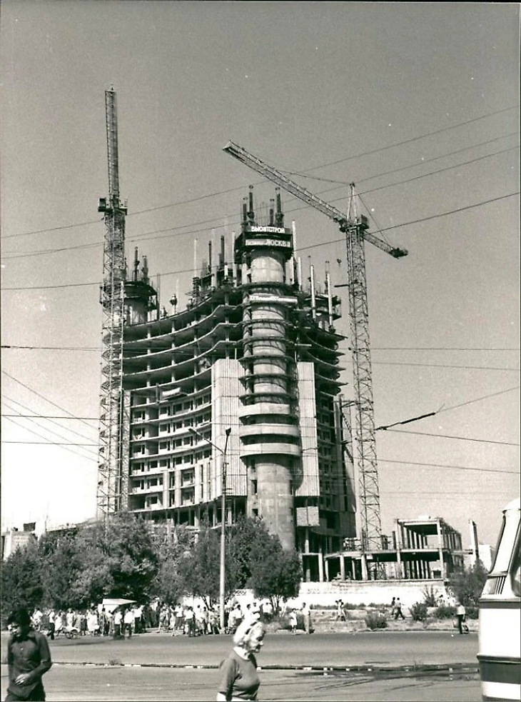1980 год. Ташкент. Строительство высотной сейсмоустойчивой двадцатитрехэтажной гостиницы «Москва» (проект института «Ташгипрогор», архитекторы: В. Спивак, Л. Нефедов, Н. Зологина, С. Хачикян, М. Захарян; инженеры: А. Сидельников, А. Асанов, Н. Брыев, С. Пестрикова)