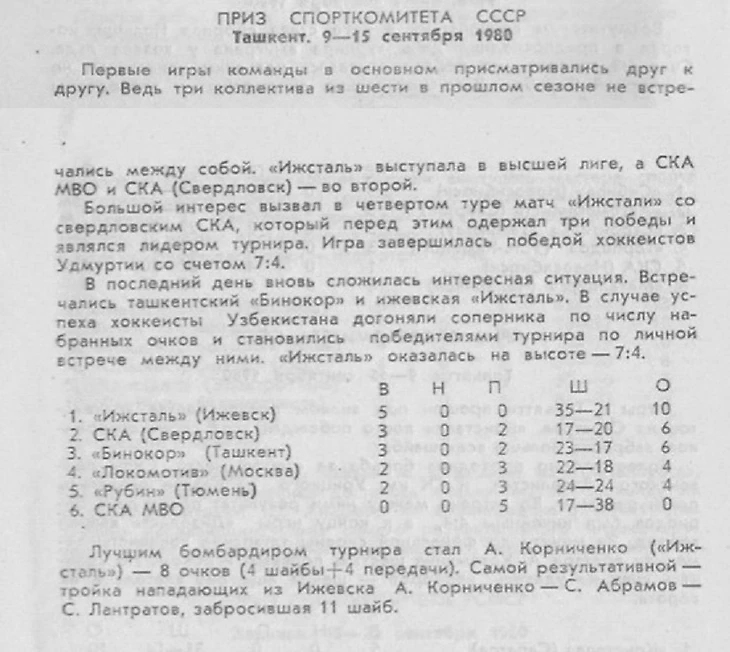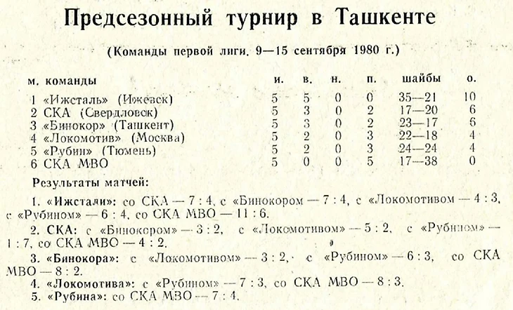 «В сезоне 1980-1981 годов хоккеисты Ташкента стремились попасть в заветную шестерку, чтобы получить мастерский балл и участвовать в дополнительном турнире с командами высшей лиги. Но на пути «Бинокора» встали торпедовцы Усть-Каменогорска. Наша команда в последних предварительных играх «достала» ташкентцев, набрав, как и они, 70 очков, и вышла вперед по лучшему соотношению игр между собой. В этом сезоне усть-каменогорцы поделили очки в Ташкенте – 5:4 и 4:7, а дома победили 6:4 и сыграли в ничью – 3:3.» (из программки усть-каменогорского Дворца спорта к матчам 6 и 7 октября 1982 года между «Торпедо» и «Бинокором»).