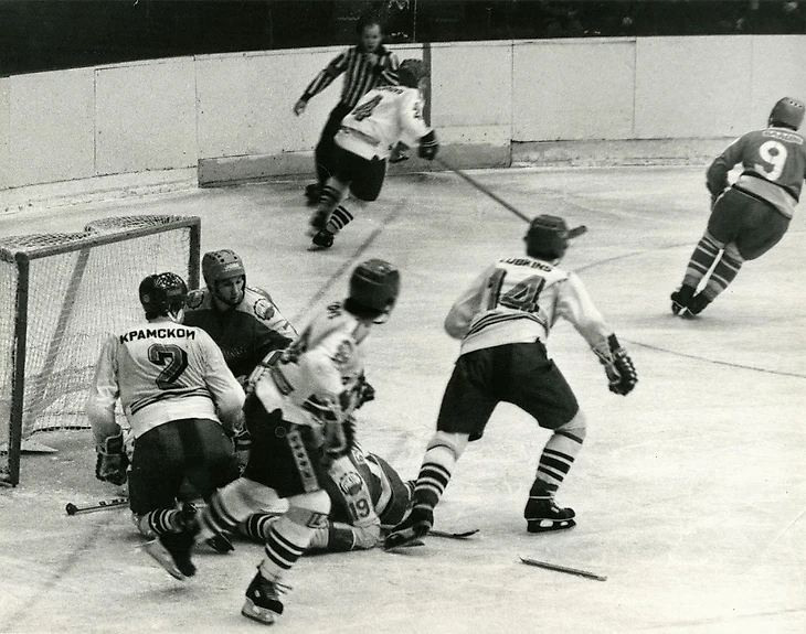 1981/82. «Трактор» (Челябинск) - «Динамо» (Рига). Анатолий Крамской (№ 2) вместе с партнерами на пятачке у своих ворот