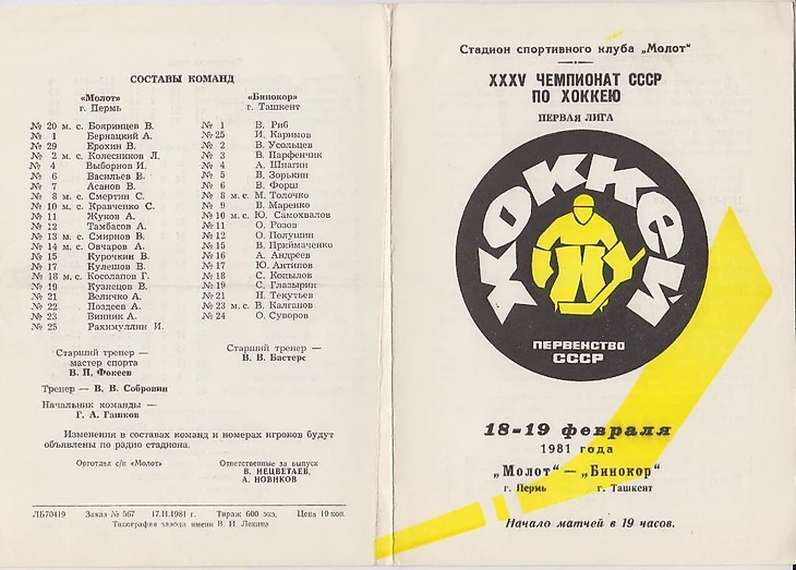 Программка пермского стадиона СК «Молот» к играм «Молота» и «Бинокором» в феврале 1981 года