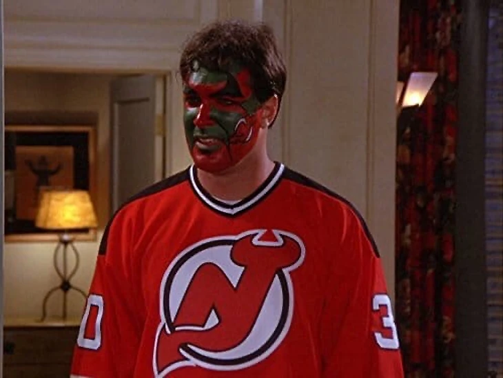 «Сайнфелд» Этот ситком стал одним из самых культовых в истории. В 6 сезоне герой Дэвид Падди, бойфренд Элейн, выиграв приглашение на игру своих любимых «Нью-Джерси Девилз», раскрылся с новой стороны. Падди, в исполнении Патрика Уорбертона, является персонажем с мягким характером, дурковатым голосом и однотипными выражениями. Но все изменилось, когда он попал на матч «Девилз». Серия называется «The face painter».