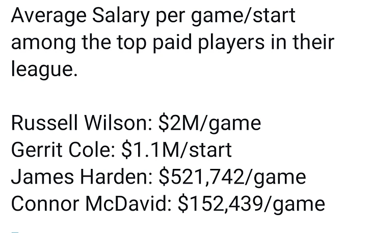 Самая большая ЗП в пересчете на один матч у квотербека клуба по американскому футболу (NFL) "Сиетл Сихокс " Рассела Уилсона , который получает в среднем 2 млн.$ за каждый матч проведенный в составе. На втором месте идет питчер бейсбольного клуба "Нью-Йорк Янкиз" Геррит Коул , недавно заключивший рекордный 9 летний контракт на сумму 324млн.$, в пересчете на игры он будет получать 1.1млн.$ за один матч. На 3 месте баскетболист клуба НБА "Хьюстон Рокетс" Джеймс Харден получающий в среднем 521 742$ за игру. Хоккей идет на 4 месте, где самая большая ЗП у нападающего клуба "Эдмонтон Ойлерз" Конора МакДэвида , который получает 152 439$ за каждый выход на лед в НХЛ.