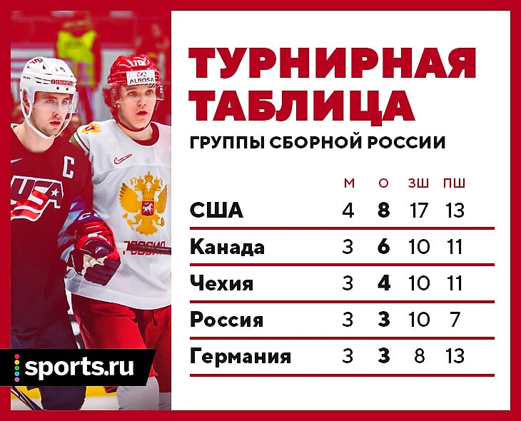 Если канадцы побеждают чехов в овертайме/по буллитам, то все равно оказываются на первом месте (из-за победы над США в личной встрече), наши откатываются на четвертое – при равном количестве очков с Чехией (по пять) уступаем ей из-за поражения в первой игре турнира.