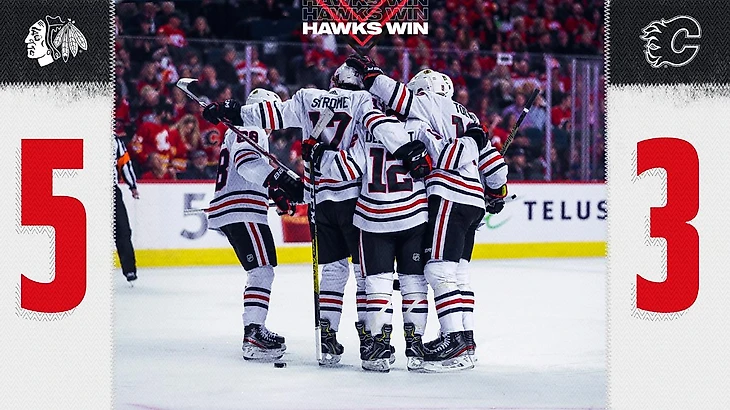 "Калгари Флэймз"-"Чикаго Блэк Хоукс" 3:5.Патрик Кейн набрал 4 очка (2+2),Алекс ДеБринкат с Диланом Стромом и Олли Маатой набрали по 2 очка (1+1),Дилан Сикура отдал 2 результативные передачи,Робин Ленер отразил 41 бросок."Чёрные ястребы" выиграли 3 матч подряд.