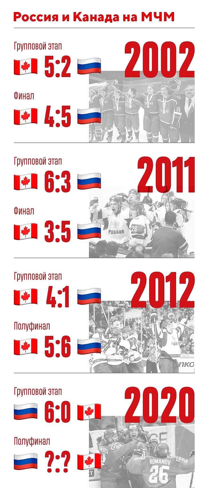 Интересная статистика перед финалом мечты: сборные России и Канады на МЧМ 4 раза играли в группе и затем встречались на разных стадиях плей-офф (3 раза в финале, один раз – полуфинал). За три предыдущих случая ни одна из команд не смогла дважды победить одного и того же соперника – и это повод с тревогой смотреть на 6:0 в группе. Впрочем, для сборной России, которая вообще никого не боится на этом МЧМ, даже такая статистика не должна стать проблемой.