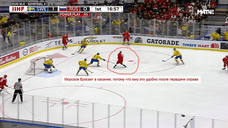 Второй, я надеюсь, вы помните и без скриншотов: шведы устали без перерыва контролировать шайбу, она попала к Морозову, который в очень русском стиле полетел вперед на ворота и бросил под штангу.
