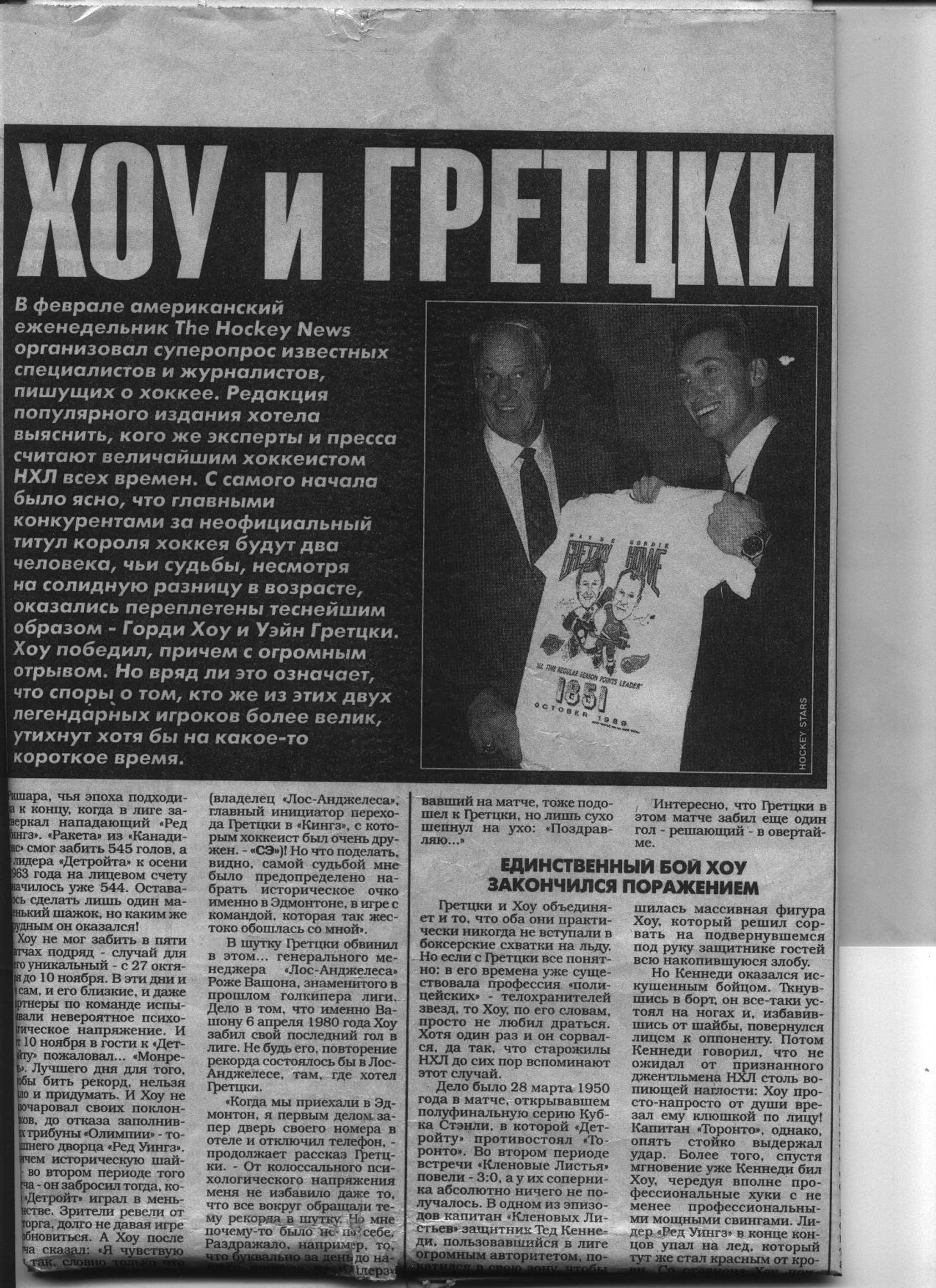 Приложение №21 за март 1997 г. вышло с огромным заголовком: «ХОУ И ГРЕТЦКИ. Великая гонка закончилась, соперничество продолжается.» В превью говорится: «В феврале американский еженедельник The Hockey News организовал суперопрос известных специалистов и журналистов, пишущих о хоккее. Редакция популярного издания хотела выяснить, кого же эксперты и пресса считают величайшим хоккеистом НХЛ всех времён. С самого начала было ясно, что главными конкурентами за неофициальный титул короля хоккея будут два человека, чьи судьбы, несмотря на солидную разницу в возрасте, оказались переплетены теснейшим образом – Горди Хоу и Уэйн Гретцки. Хоу победил, причём с огромным отрывом. Но вряд ли это означает, что споры о том, кто же из этих двух легендарных игроков более велик, утихнут хотя бы на какое-то короткое время.»