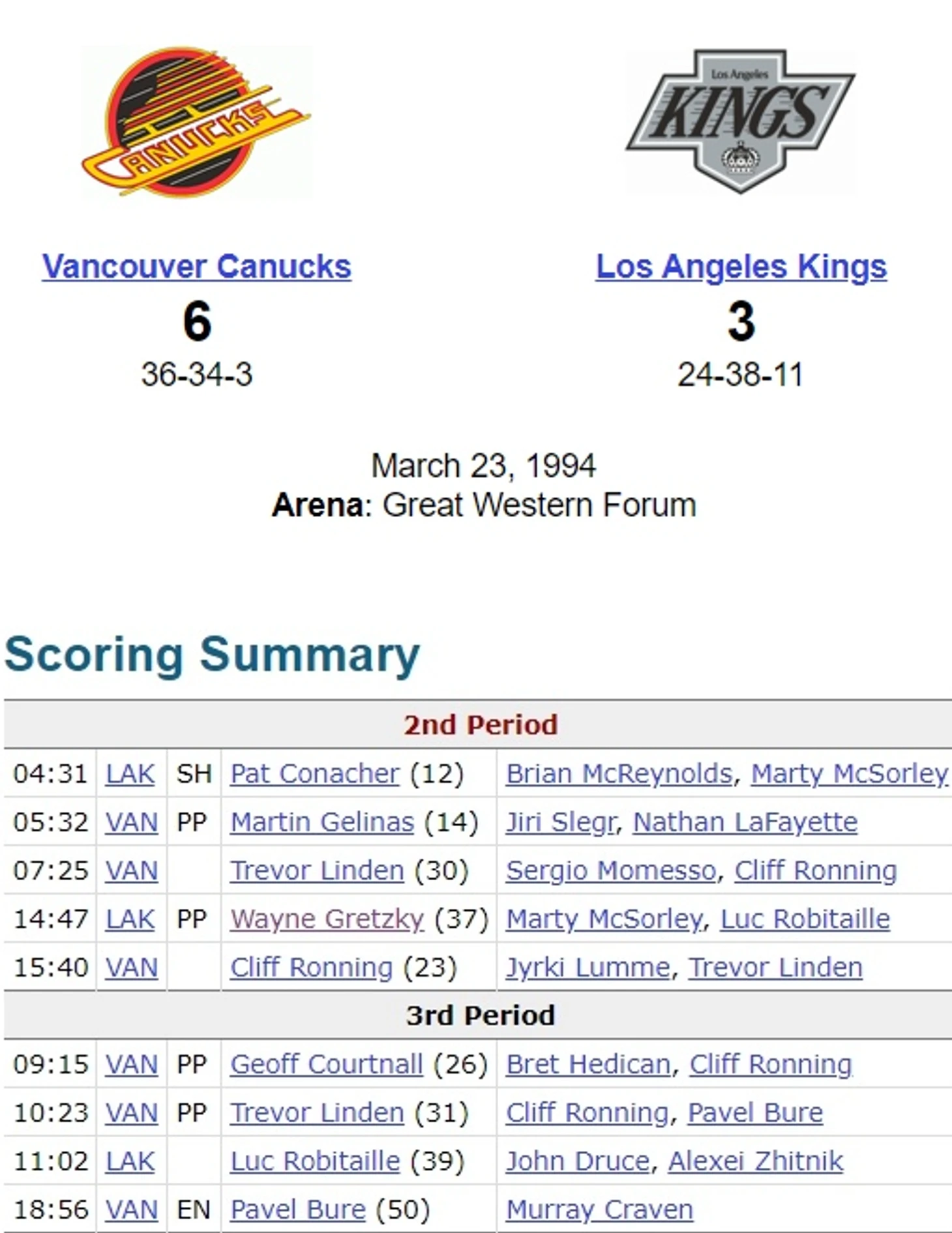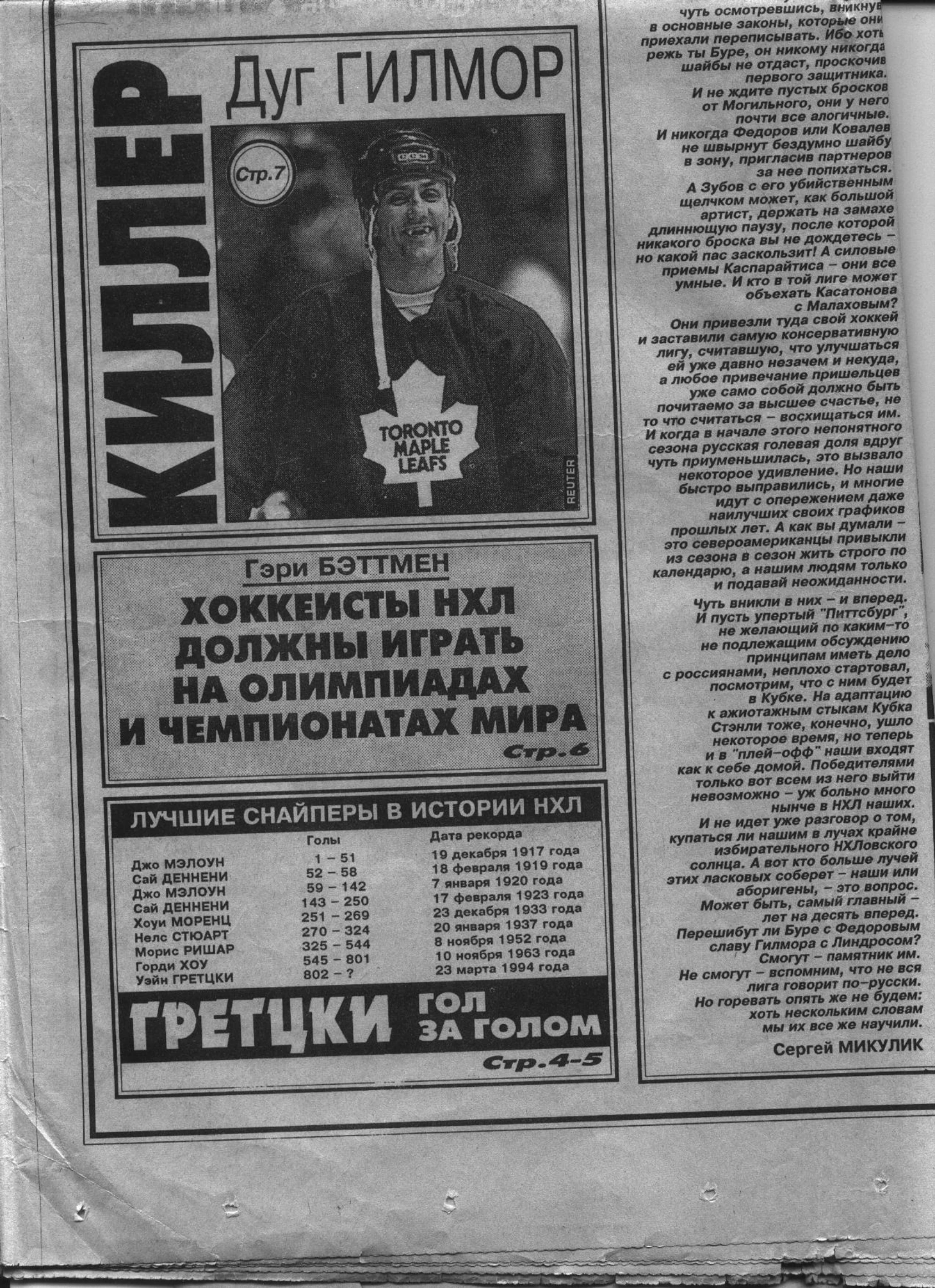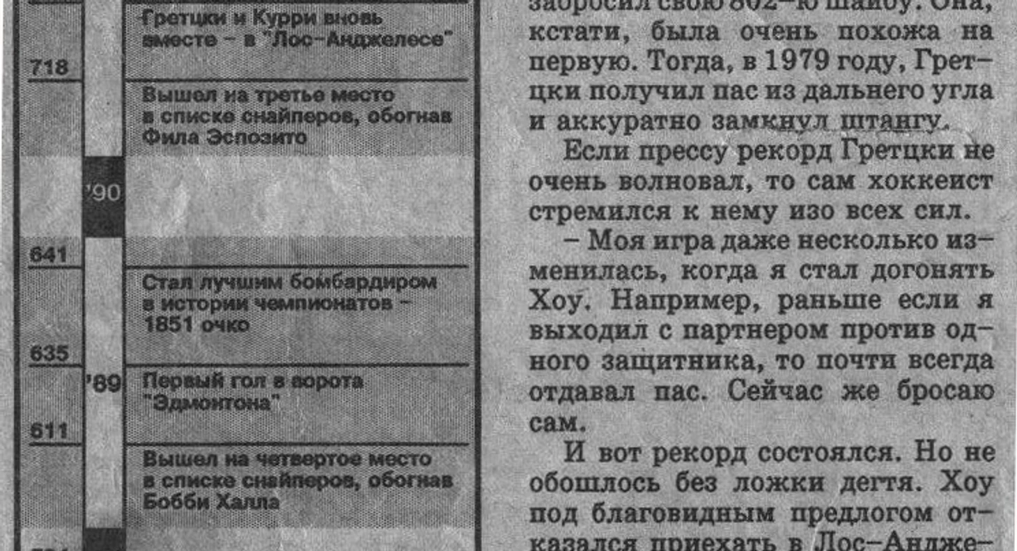 Процитированные в начале текста слова Хоу я нашёл в спецвыпуске, который был посвящён итогам РЧ 1993-94. Издание вышло через несколько недель после того, как Гретцки забил рекордную 802-ю шайбу.