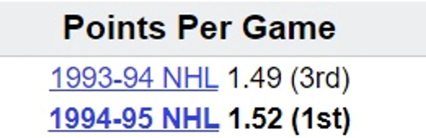Выше этот показатель только у Лемьё, но за 2 сезона он сыграл лишь в 22 играх. У Буре ещё не было столько серьёзных травм, зато были 2 сезона подряд по 60 и искромётный плей-офф 1994. В начале 1995 г. перспективы Линдроса и Буре в плане карьерной статистики были на своём историческом максимуме и даже в такой момент ни Линдрос, ни Буре ни разу не упомянуты в качестве хотя бы малюсенькой угрозы главному рекорду лиги. Не того полёта птицы, но если всё-таки случится чудо, и кто-то когда-то сможет побить главный рекорд лиги, то это событие станет поистине эпохальным. Ведь в статье так прямо и сказано, что 23.03.94 завершилась эпоха Хоу, и началась эпоха Гретцки.