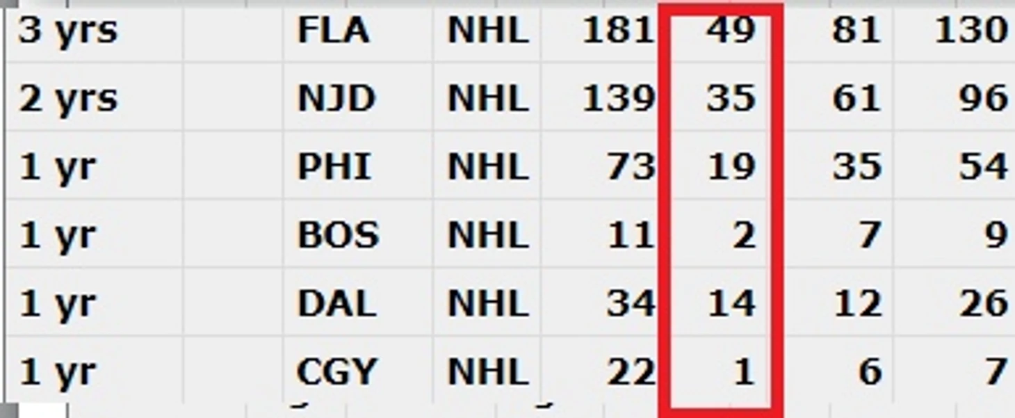 Количество шайб на момент окончания сезона с последним полтосом в карьере: