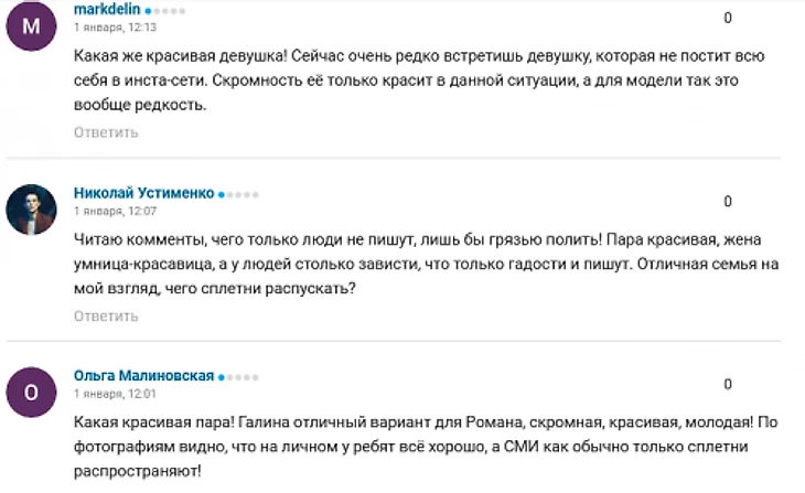 Естественно, обожатели Романа не могли обойти и недавний пост про его жену. Но в этот раз эти ребята чего-то перепутали:  если обычная стратегия была написать пару-тройку одобрительных комментов, а потом поставить им сотню плюсов, то в этот раз ( по неизвестным причинам ) вышло наоборот. Комментов накидали - будь здоров, а заплюсовать почему-то забыли. Видимо, ботам тоже не чужды обычные человеческие слабости, и новогодние праздники дали о себе знать.