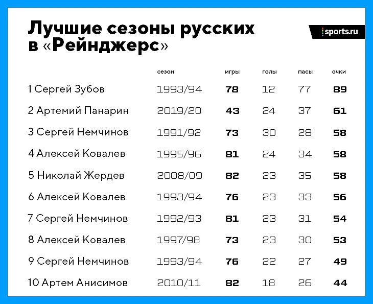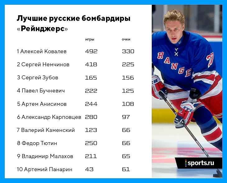 В общей таблице русских снайперов «Рейнджерс», конечно, лидирует Алексей Ковалев. Но Панарину потребовалась всего половина чемпионата, чтобы ворваться в топ-10. Контракт с Нью-Йорком у него до 2026-го – ближе к тому году взглянем на эту таблицу еще раз. В ней наверняка будут кардинальные изменения.
