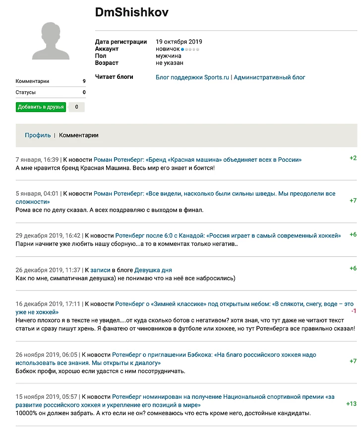 Боты постят и плюсуют хвалебные комменты про Романа Ротенберга. Это обнаружил пользователь Sports.ru