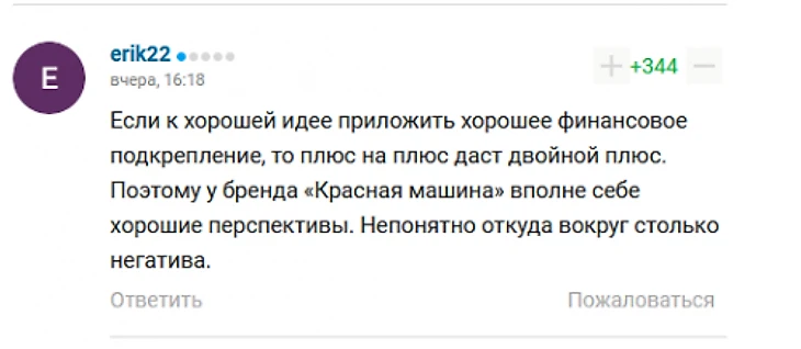 В тот же день подобное случилось в комментариях под новостью Роман Ротенберг: «Бренд «Красная машина» объединяет всех в России». Вот эти два комментария к вечеру вышли на первые места, собрав много плюсов.