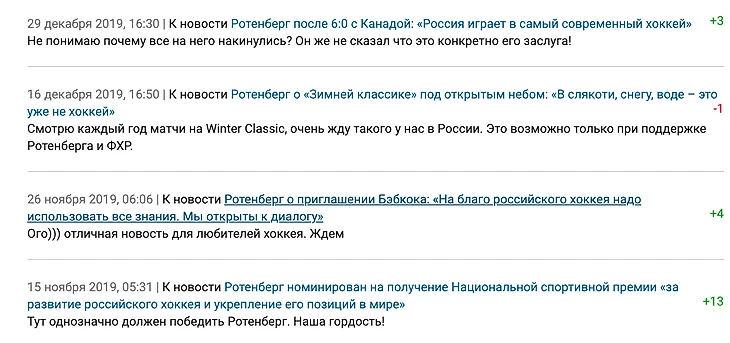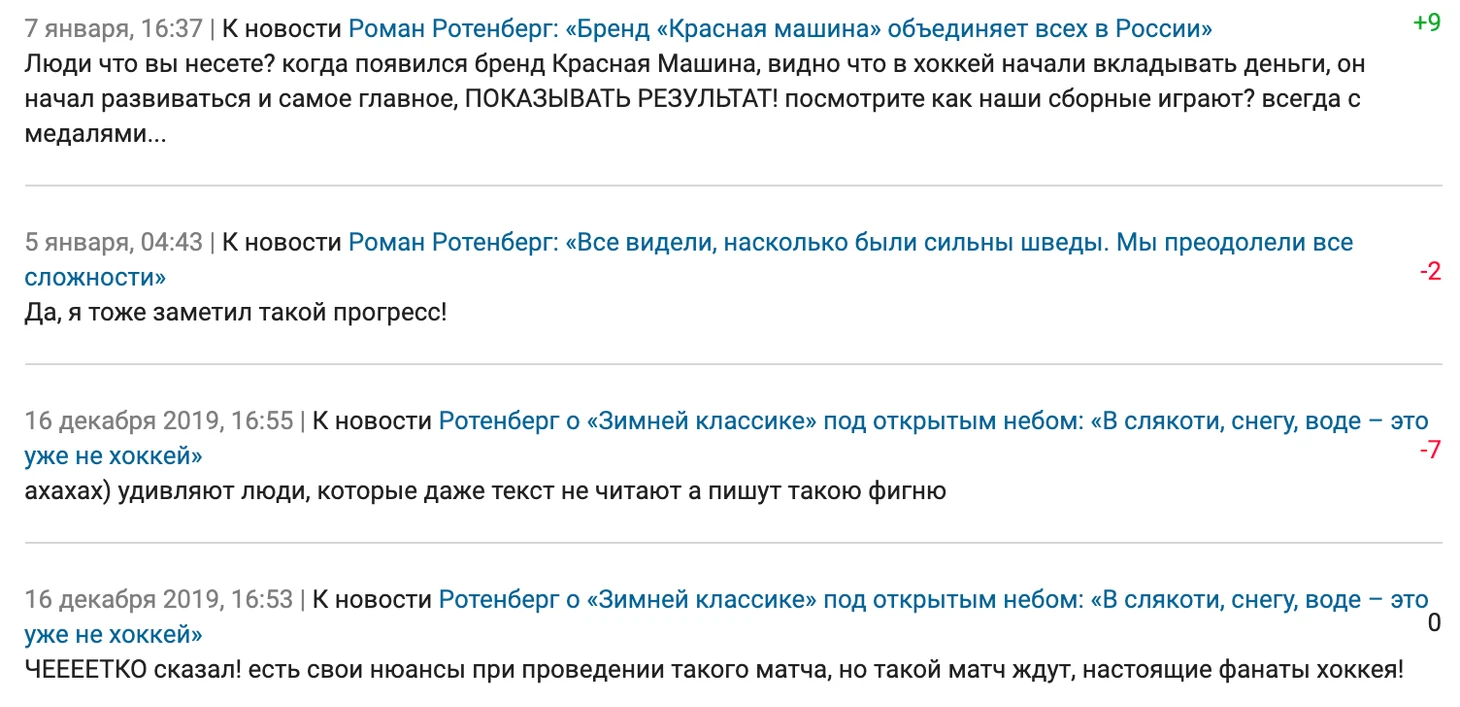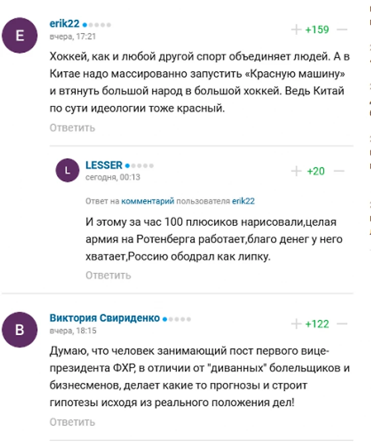 К примеру, 7 января через 5 часов после публикации новости Роман Ротенберг: «Представьте, что каждый китаец купит клюшку или коньки. Это огромные деньги» начали появляться и проникать в топ вот такие комментарии. Они очень быстро собрали много плюсов.