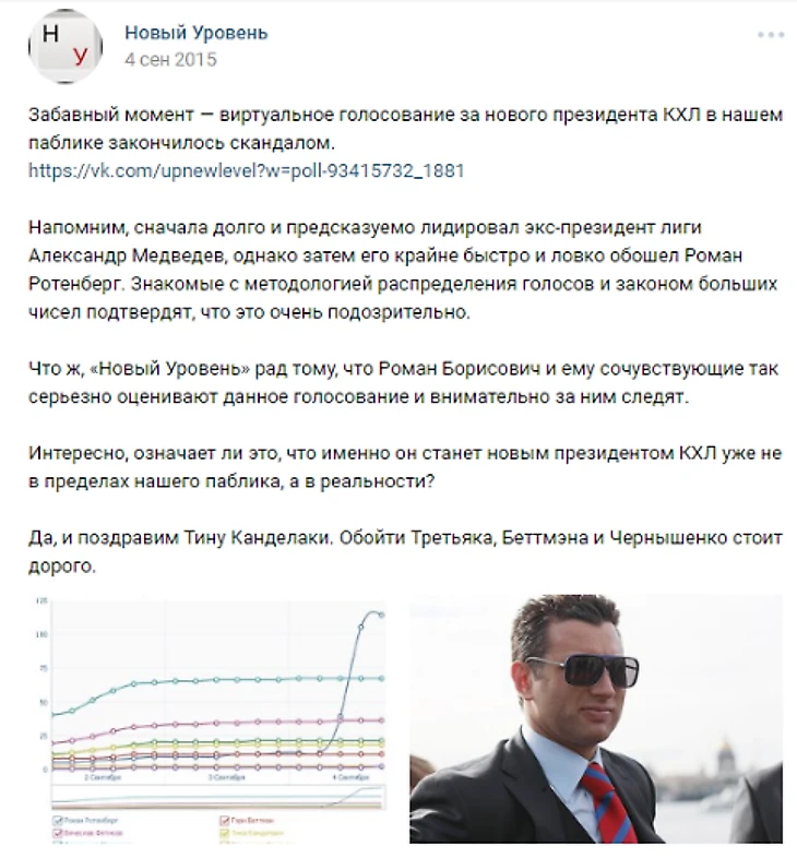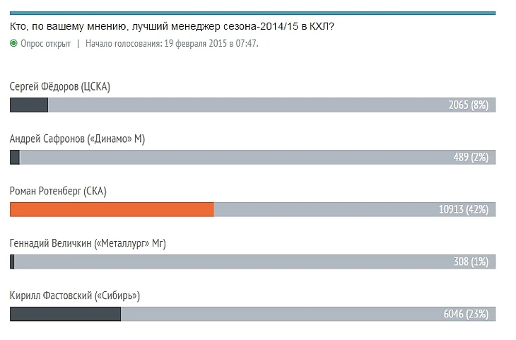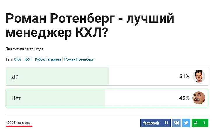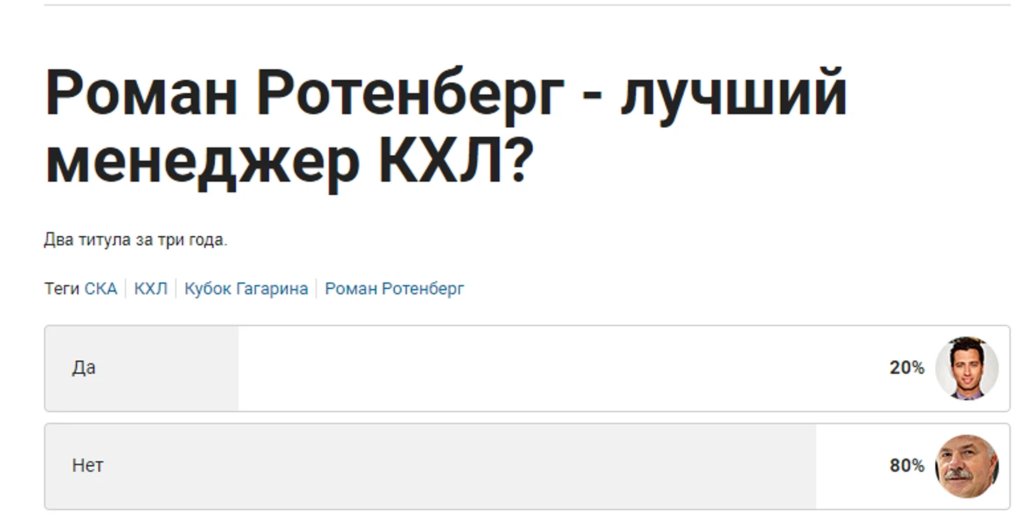 Например, в апреле 2017 года на Sports.ru вышел опрос «Роман Ротенберг – лучший менеджер КХЛ?». Вариант «Нет» сразу вышел вперед – за него голосовали примерно 80% человек из первых 4-5 тысяч участников. Но потом что-то пошло не так.