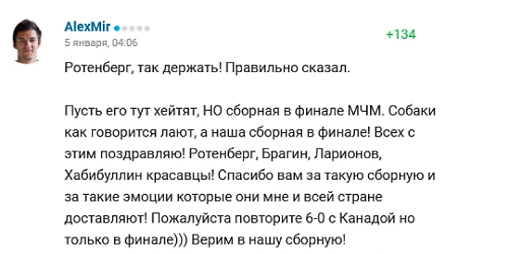 В восемь вечера 4 января вышла новость Роман Ротенберг: «Все видели, насколько были сильны шведы. Мы преодолели все сложности», а утром 5-го в топ неожиданно выбился такой комментарий.