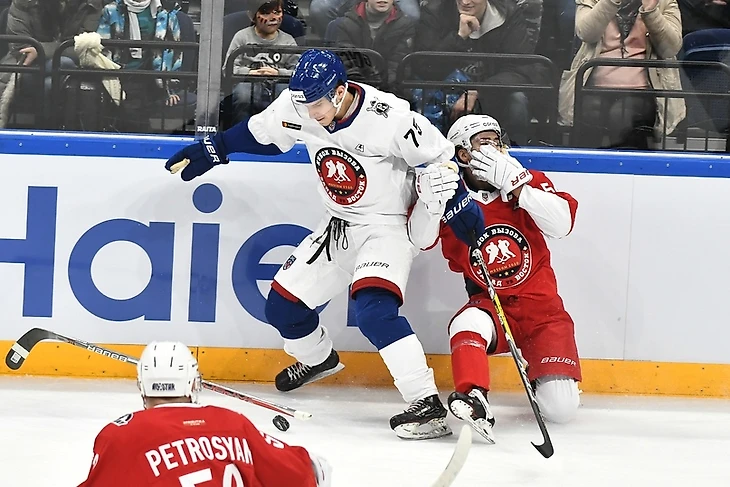 Ну и какой же «Русский Витязь» без драки? Уже в первом периоде он на чужом пятаке потолкался с Даниилом Зайцевым. Полноценной битве не дали состоятся арбитры, но по две минуты штрафа за грубость ребята получили.