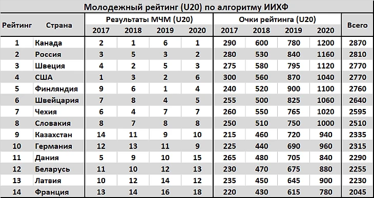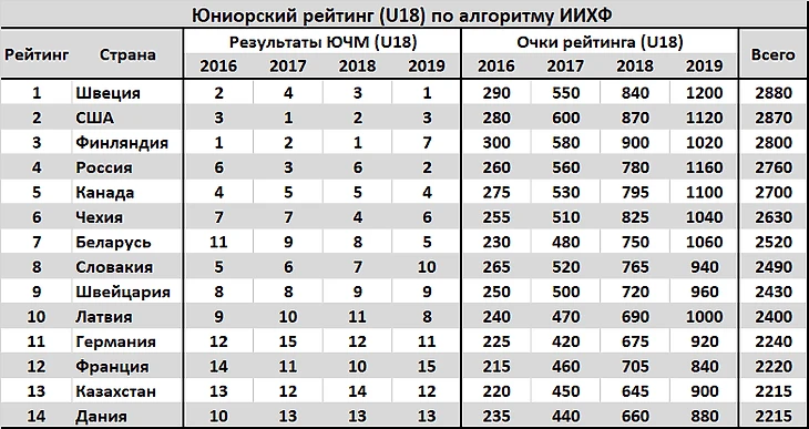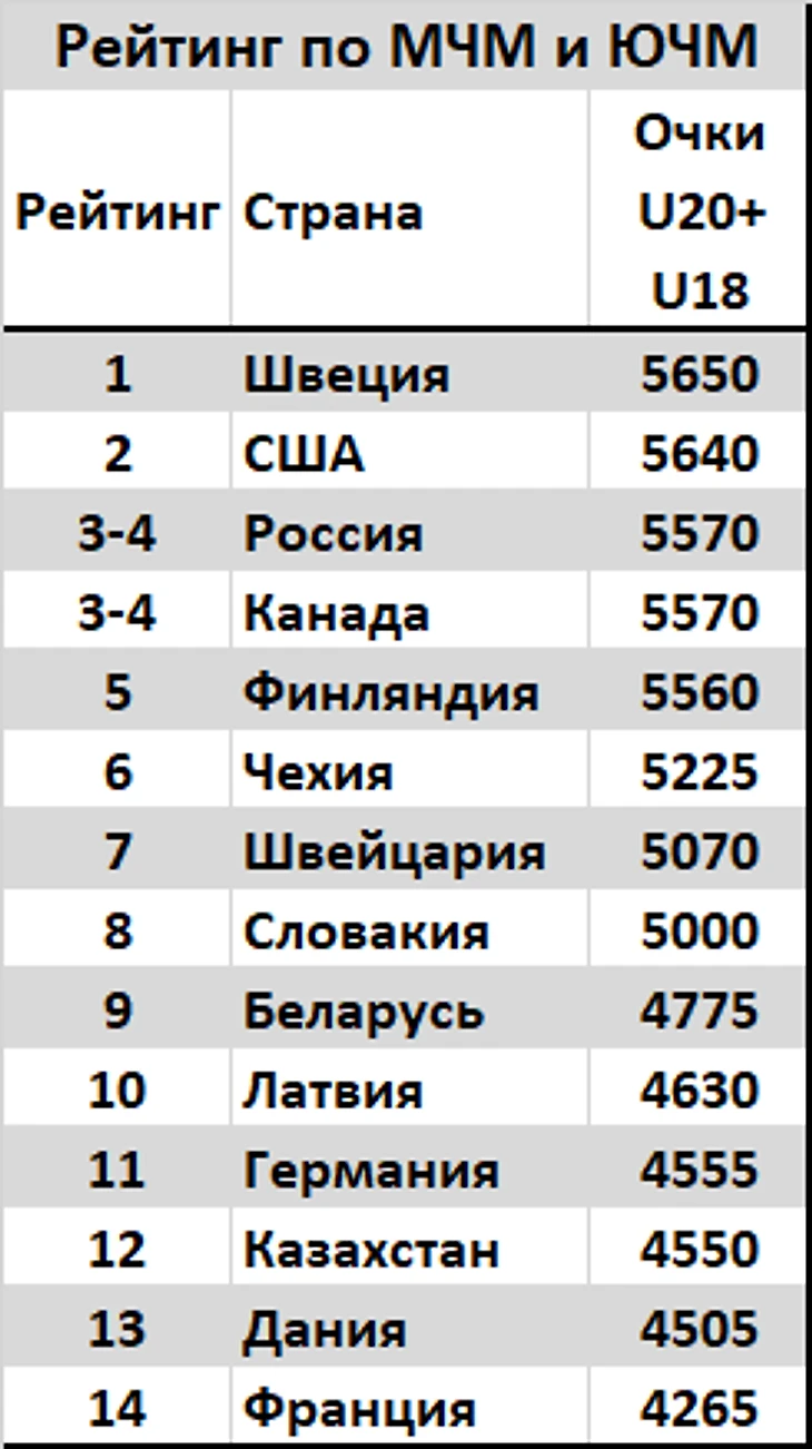 Если суммировать очки молодежных и юниорских рейтингов, то первое место будет за Швецией, второе за США, третье место делят Россия и Канада.