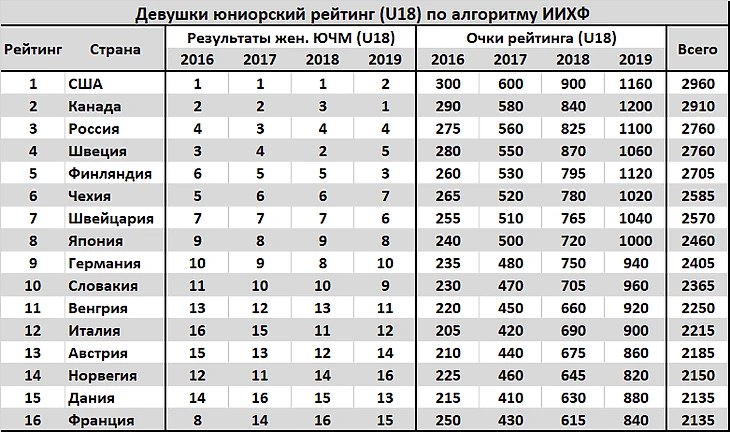 В рейтинге U18 Россия занимает четвертое место с 2760 баллами, за 6, 3, 6 и 2 места в ЮЧМ 2016-2019 годов.