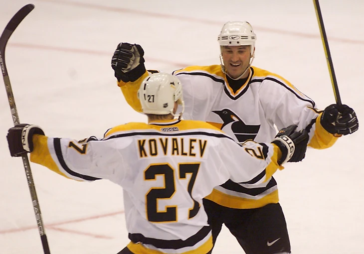 И вот в эту команду , команду "сборной чехословацкого хоккея"- (хотя окончательно она ей станет в сезоне 2000-2001) переходит Алексей Ковалев. Где уже были наши- Герман Титов, Алексей Морозов, Дариус Каспарайтис и Максим Галанов. Иногда выходил на лед Виктор Игнатьев. И Алексей начал по восходящей. 46 очков в сезоне 98-99, 66 очков - 99-00, и наконец пик карьеры в Питтсбурге сезона 00-01 сразу 95 очков и выход в финал конференции.