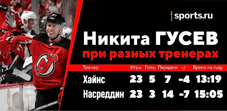 Через две недели после увольнения Хайнса «Девилс» фактически объявили, что сезон для них закончен — Тэйлора Холла обменяли в «Аризону», и конфигурацию троек пришлось менять: звено Зэйджака, которое и так играло много, окончательно стало вторым. Гусев тоже получил прибавку к игровому времени — и ответил ростом производительности. При новом тренере Никита — лучший бомбардир в команде:
